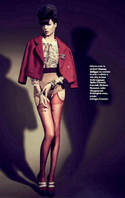 Thanks to Catherine, the designer for the UK lingerie label Kiss Me Deadly, we discovered these gorgeous photographs from Grazia magazine. Kiss Me Deadly (whose Candybox Knickers are shown in the 4th pic from the top) happens to be featured among some of fashion's top designers, including Carine Gilson, Dolce & Gabbana, Chanel & Prada in this spread by Nelson Simoneau entitled "Sex and Vintage". As you can see, there's a definite vintage vibe to each image with a hint of lingerie here and there...whether it's a bit of a bra showing or a pretty pair of stockings or thigh highs. We are really impressed by the beauty of the hosiery, which happens to be provided by an Italian label called Transparenze - those lilac thigh highs are so beautiful! Once again we are so pleased to see hosiery as a featured trend this season, much more so than previous years (since it inevitably becomes more popular as the weather gets cooler).